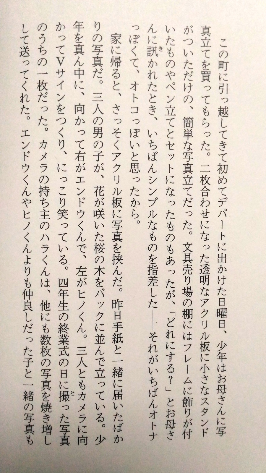 家に帰ると、さっそくアクリル板に写真を挟んだ。昨日手紙と一緒に届いたばかりの写真だ。三人の男の子が、花が咲いた桜の木をバックに並んで立っている。少年を真ん中に、向かって右がエンドウくんで、左がヒノくん。三人ともカメラに向かってVサインをつくり、にっこり笑っている。四年生の終業式の日に撮った写真のうちの一枚だった。カメラの持ち主のハラくんは、他にも数枚の写真を焼き増しして送ってくれた。エンドウくんやヒノくんよりも仲良しだった子と一緒の写真もあったが、写真立てに入れるのは、この写真でなくてはいけない。